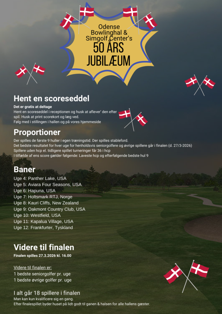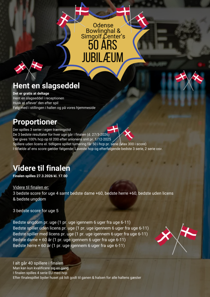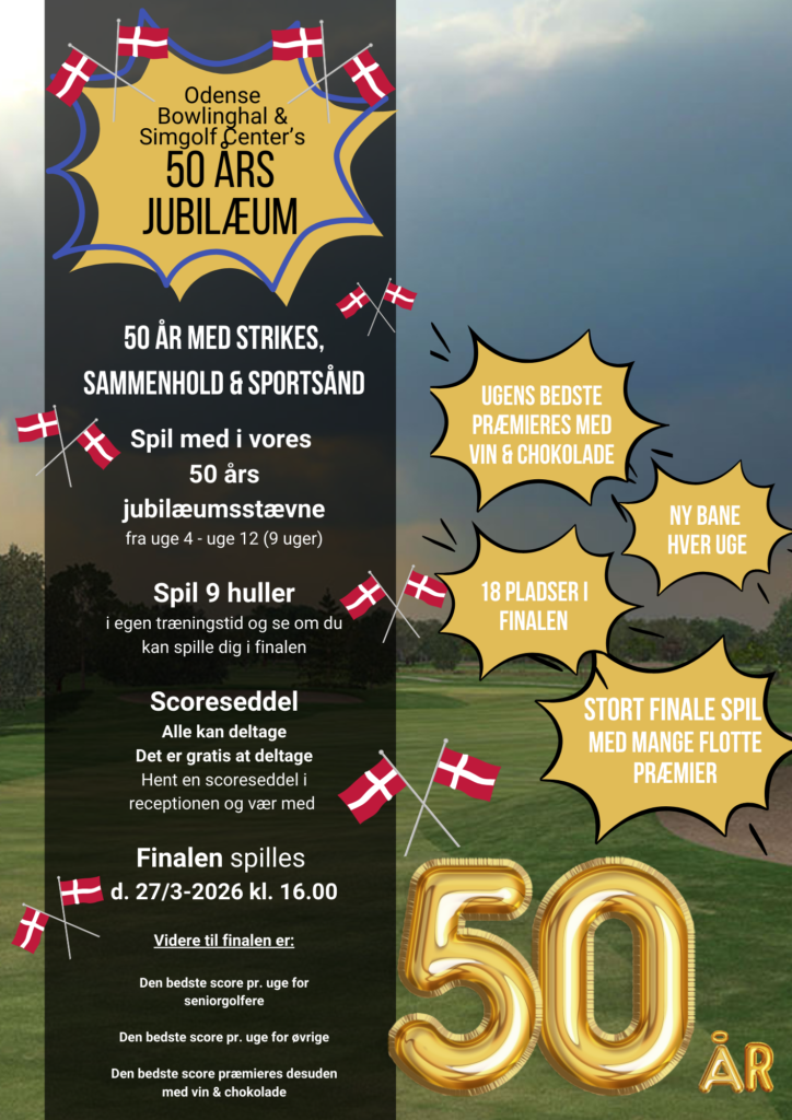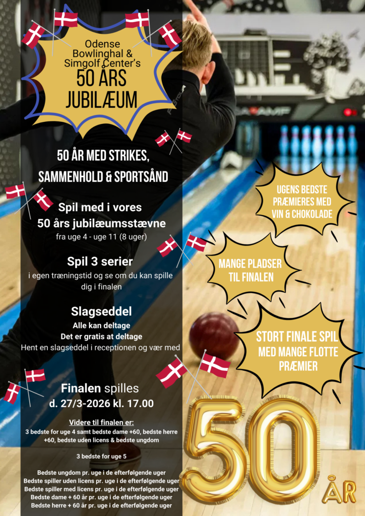 Odense Bowlinghal & Simgolf Center inviterer til 50 års jubilæumsstævne, hvor alle kan være med – uanset niveau. Der er stævne i både bowling & simulatorgolf og der spilles over 9 uger, hvor der jagter strikes og kæmper om pladserne i den store finale på vores 50 års fødsesldag d. 27. marts 2026.