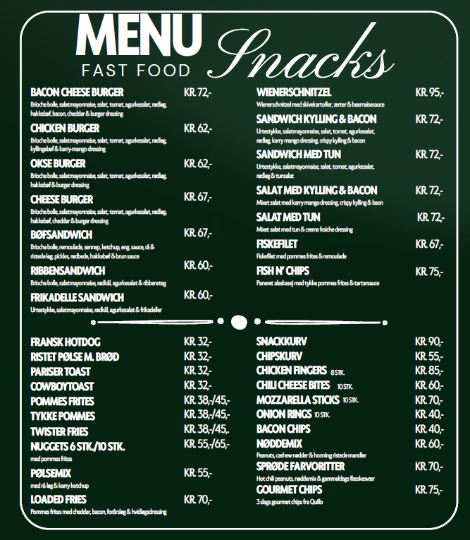 Uges ret inkl fl. øl eller 0,5 l. sodavand kr. 98,-